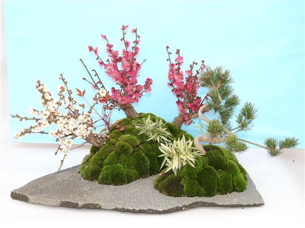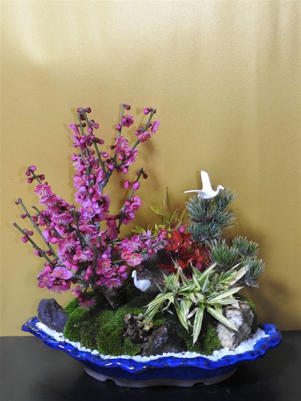 超大作!長さ80cm余の”宝船”を鉢に使った、堂々たる松竹梅。