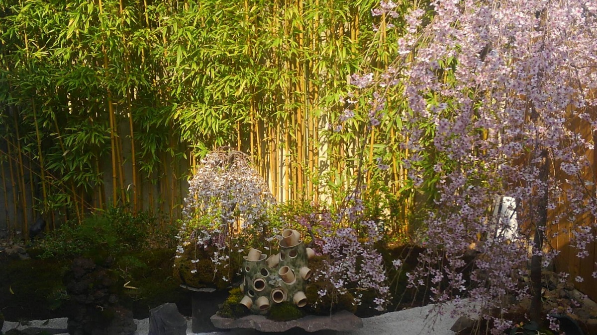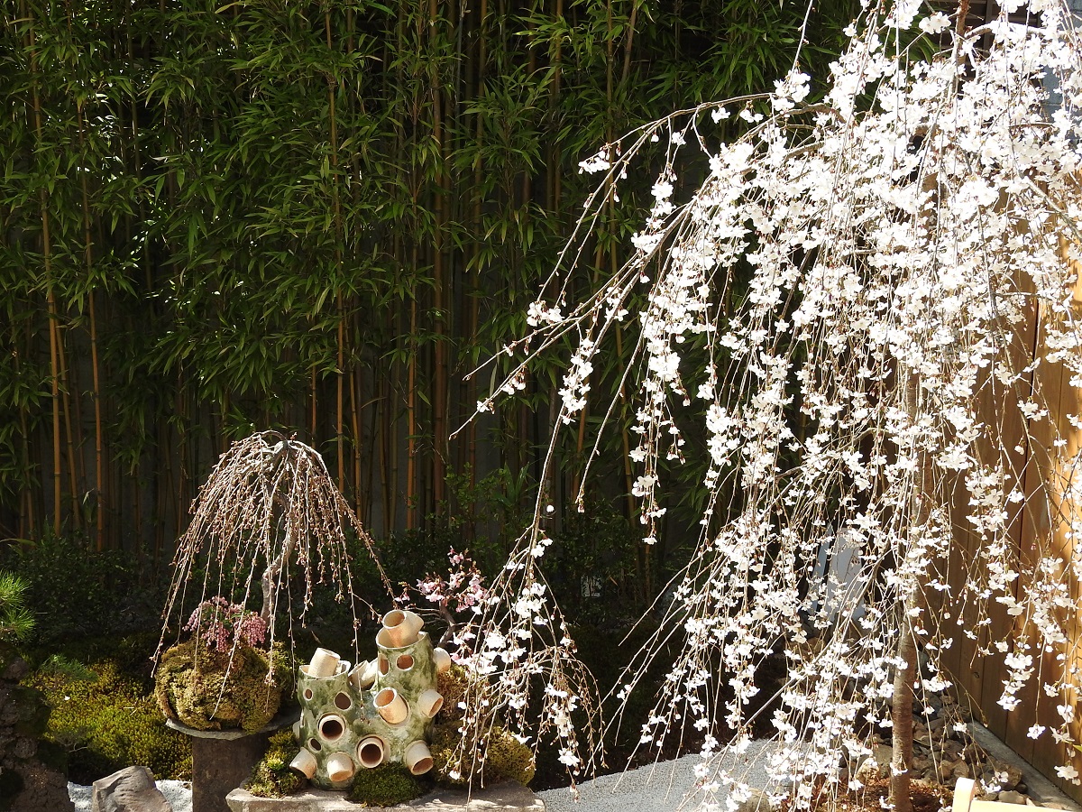 中国茶カフェ「ISO茶房」さまの庭をリニューアルしました。白川砂と寒水石のコントラストが鮮やかです。右手前の富士しだれ桜のつぼみは薄紅色にふくらんでおり、もうじき咲きそうです。あさってからの展示・発表会の期間中には、満開の花々が皆さまをお迎えするでしょう。(H30.3.10完成)