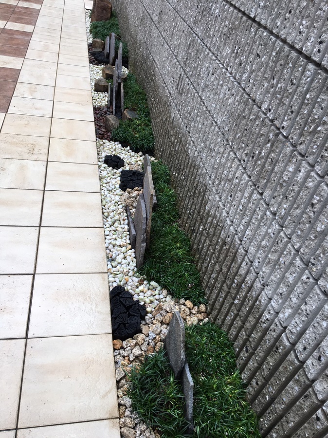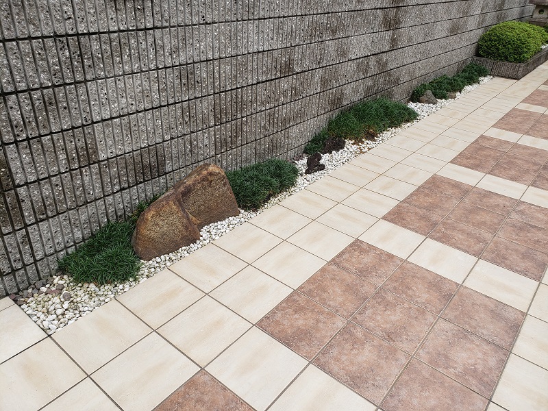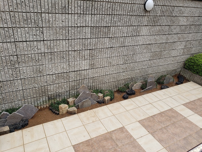 改装前の様子です。下がすぐコンクリートになっており、土の深さは数cmしかなかったため、樹木は植えられず、日当たりの関係で苔も育たないので、既存の庭石とタマリュウ、白玉石、赤石を用いて作庭しました。奥行きも浅いので、遠近感を出すためにひと工夫欲しいところです。
