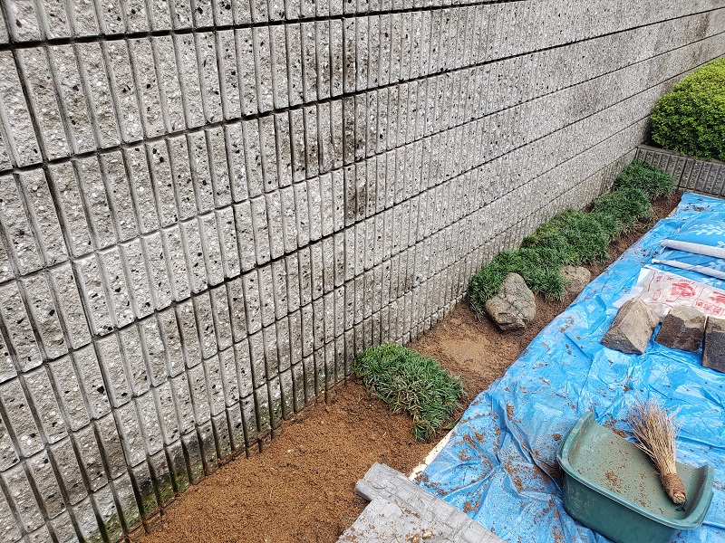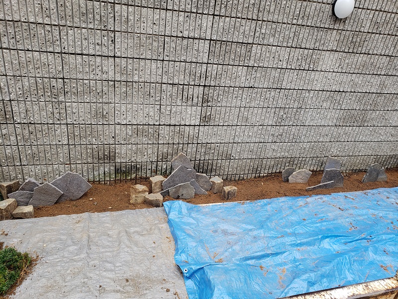 今回は新たに鉄平石、六方石、炭などを入れて石組みを行いました。石組みができたらタマリュウを配置します。