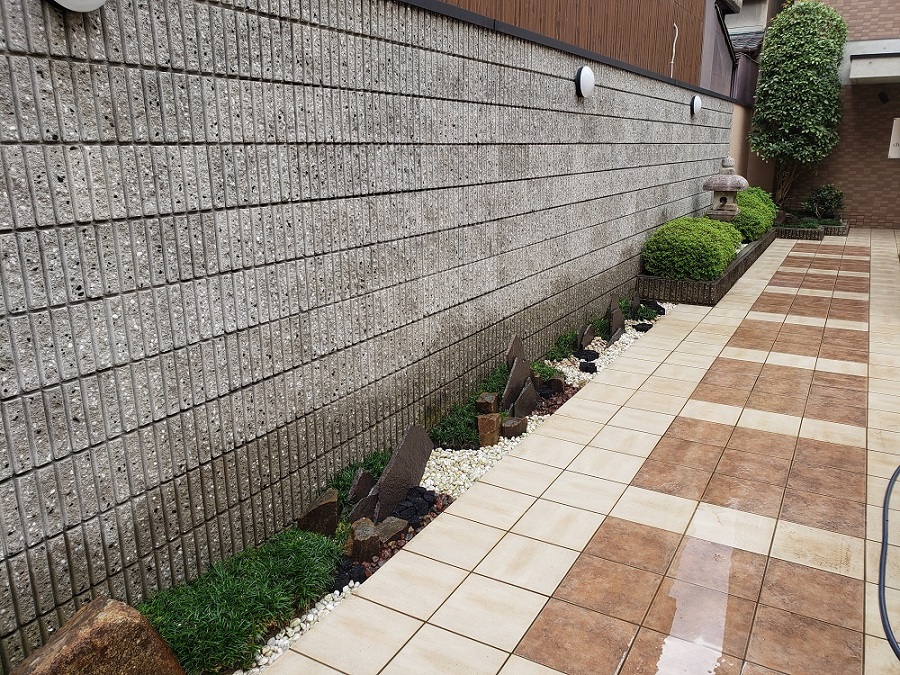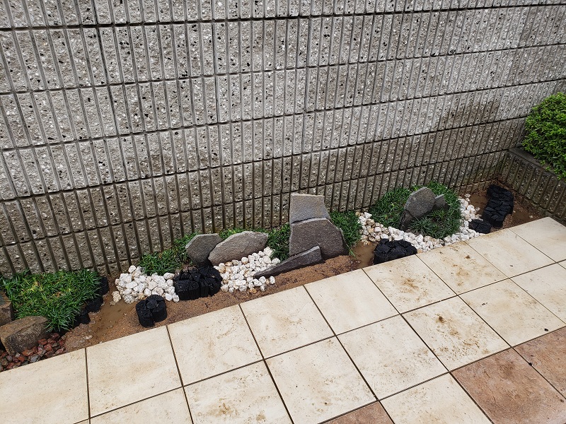 改装後です。薄い鉄平石を重ねることによって、実際以上の奥行きを感じられる仕上がりになりました。白い玉石と炭色のコントラストも鮮やかです。