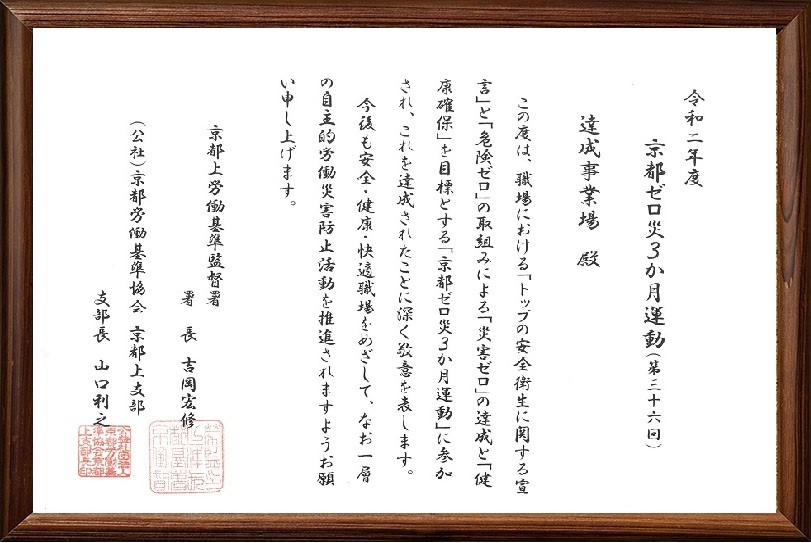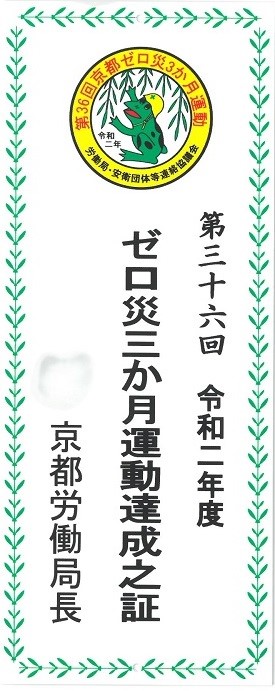 令和2年7月1日〜9月30日の間、労働災害 0件を見事達成し、「ゼロ災3か月運動達成之証」をいただきました。