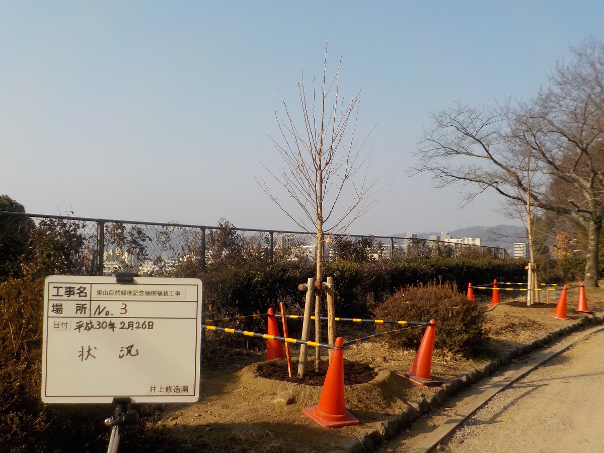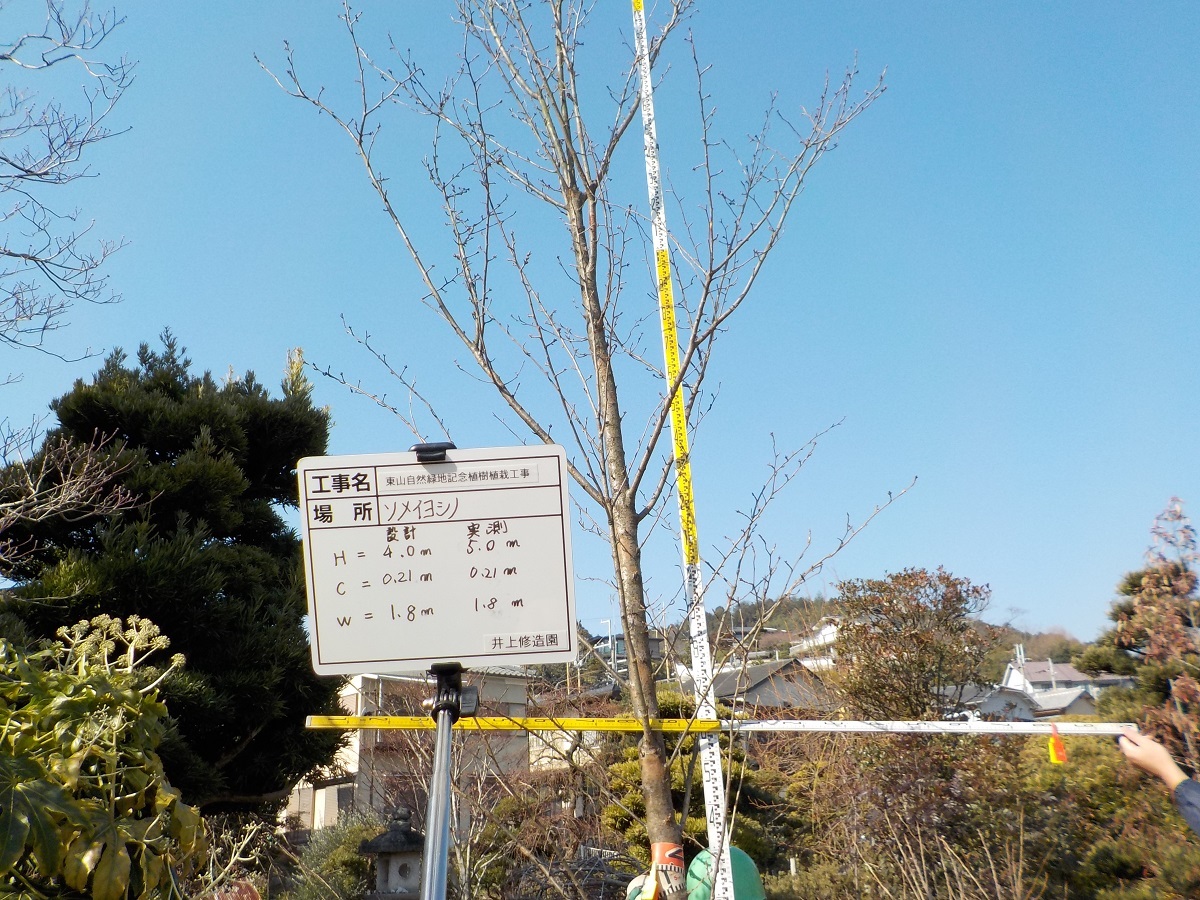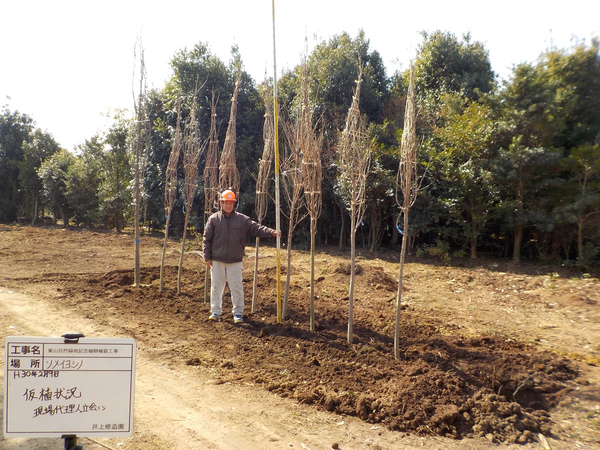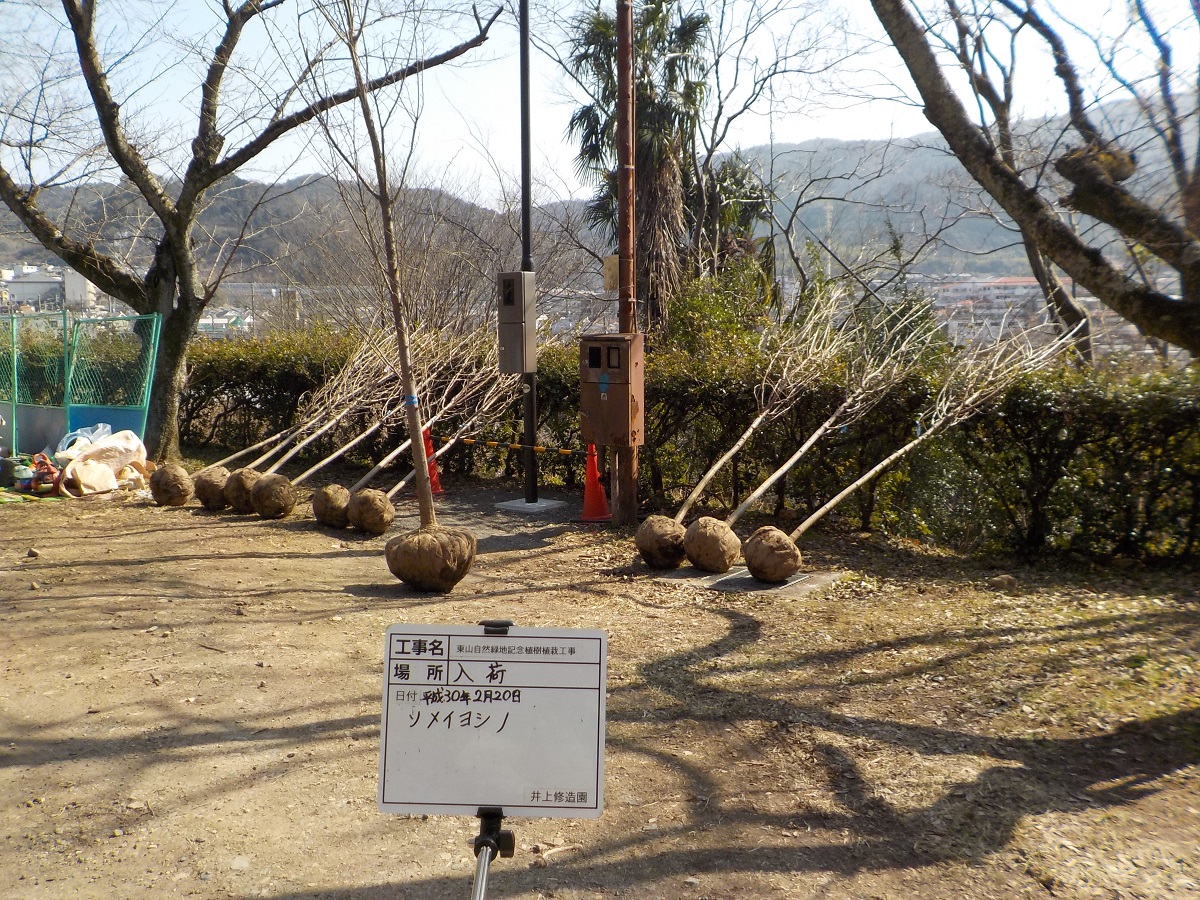 今回、井上修造園が担当したのは、山科疎水近くの東山自然緑地(山科区四ノ宮柳山町)の散策路です。ソメイヨシノを10本植樹しました。