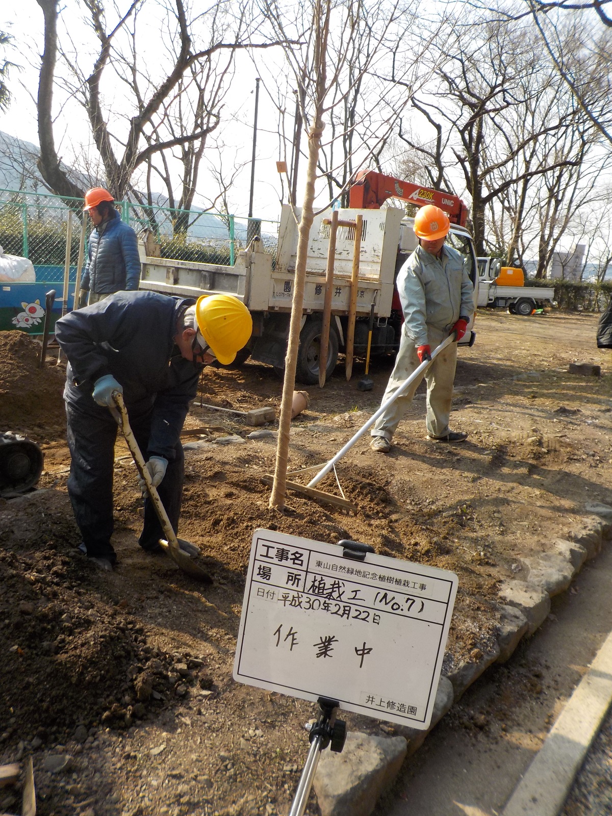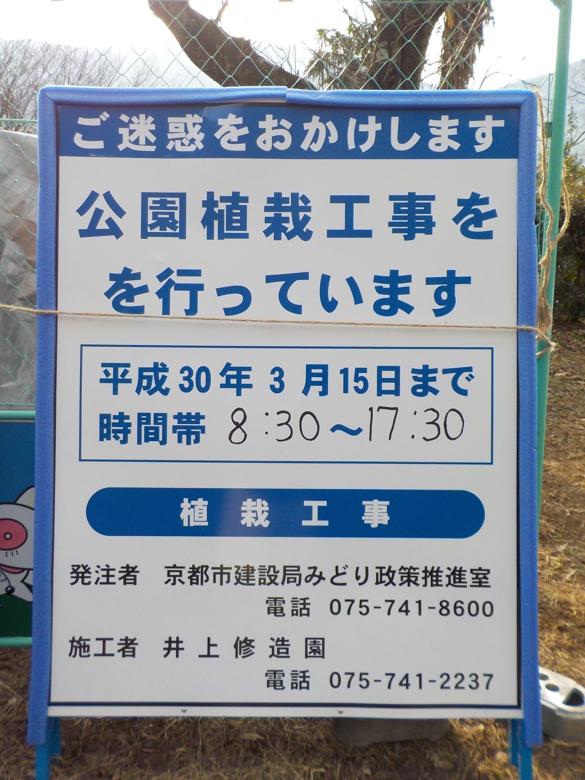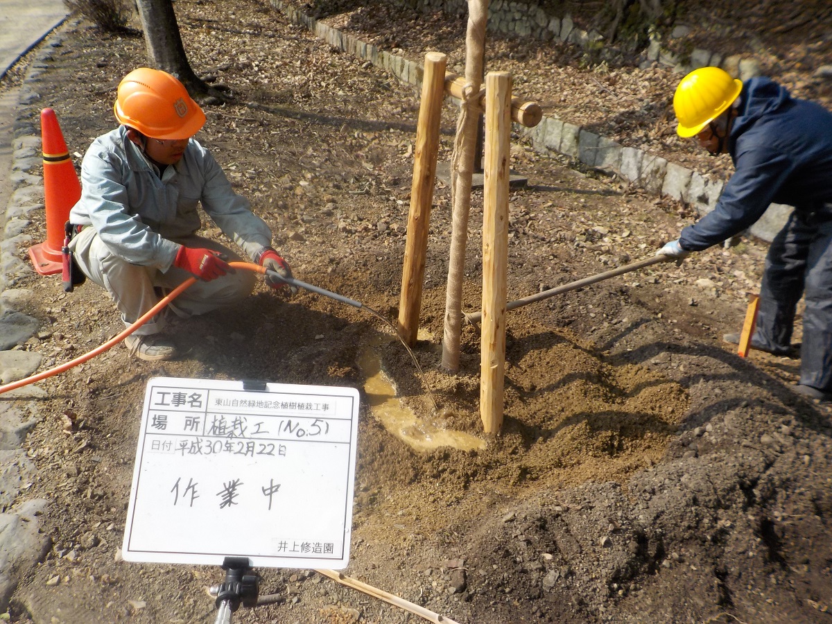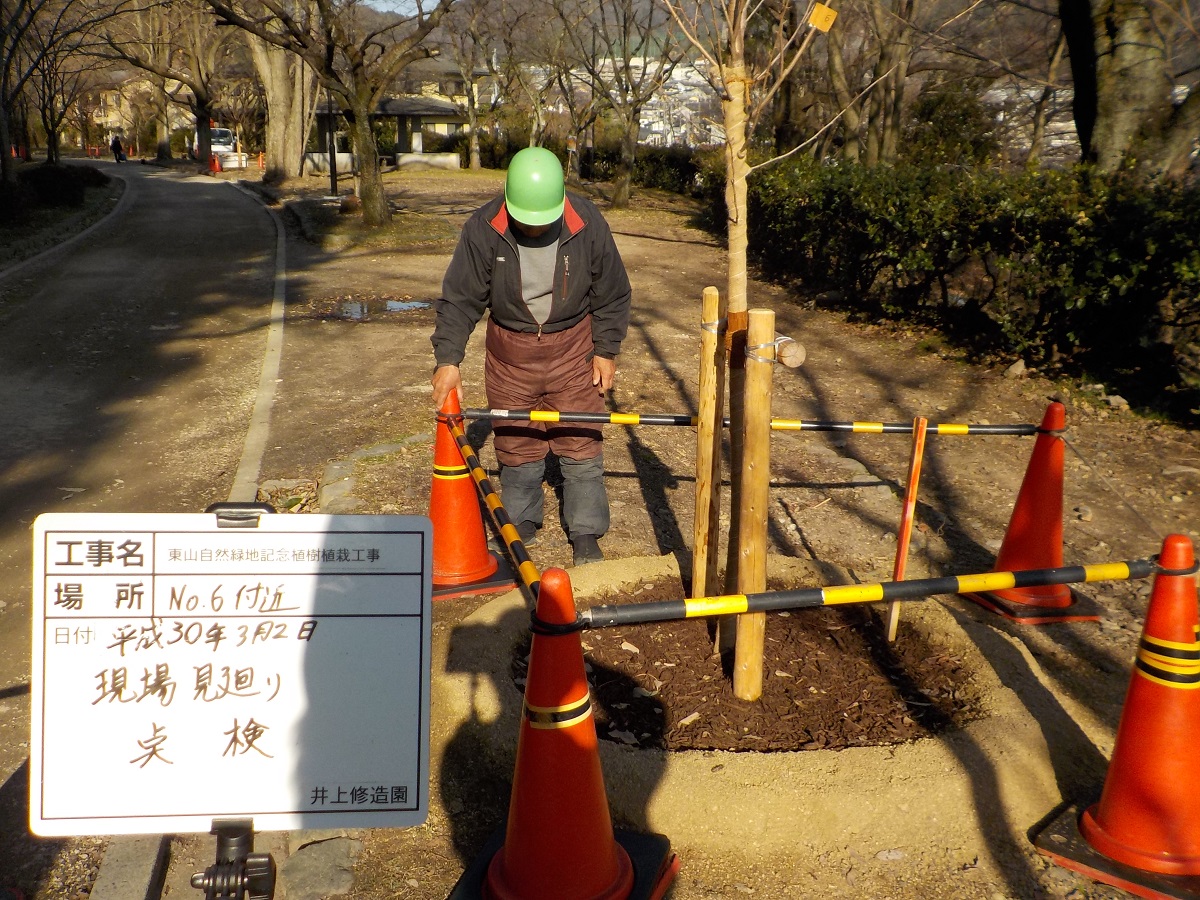 今回、井上修造園が担当したのは、山科疎水近くの東山自然緑地(山科区四ノ宮柳山町)の散策路です。ソメイヨシノを10本植樹しました。