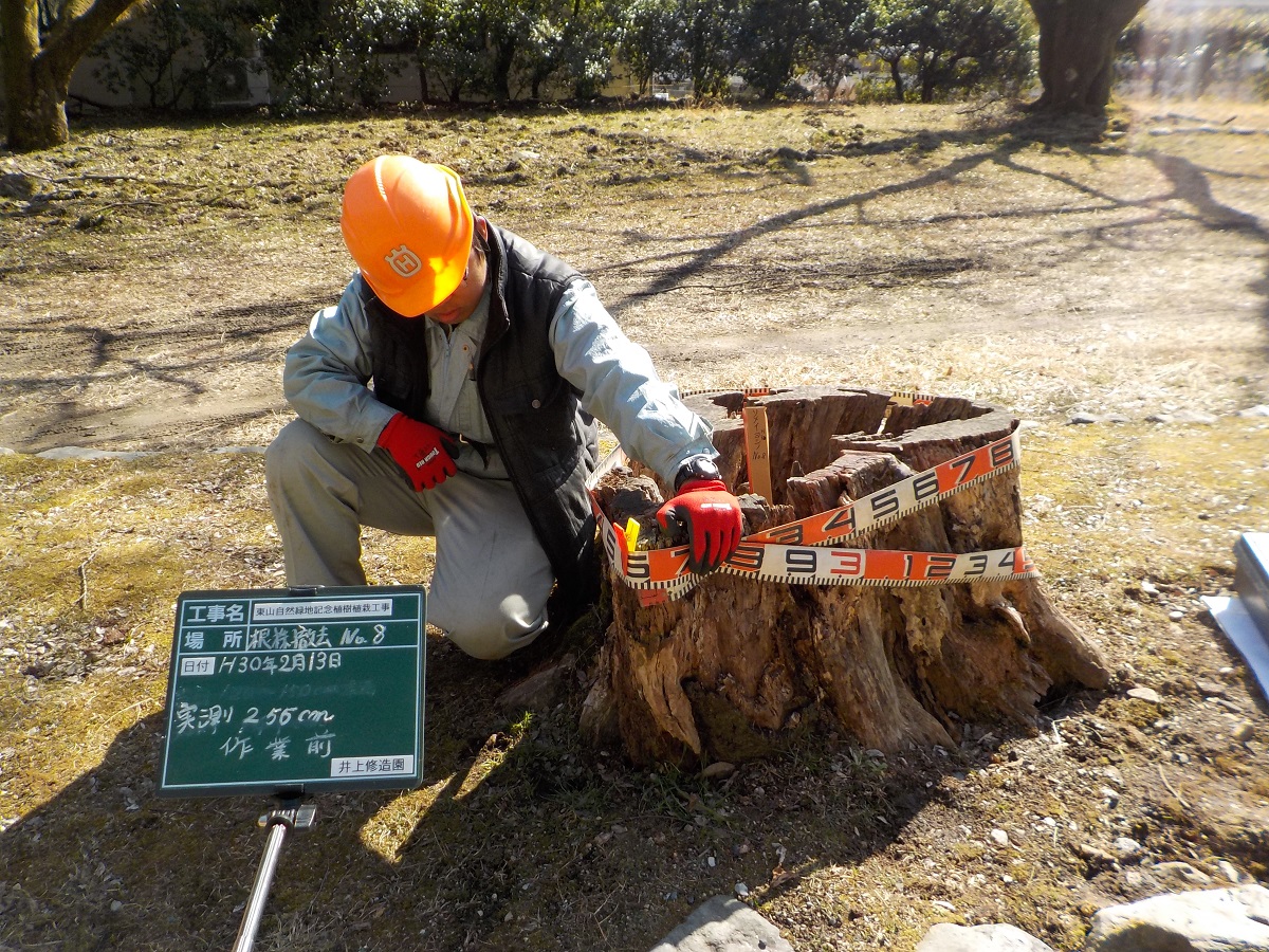 公共工事は規定があるので、高さ・幅・幹の太さを測り、京都市の指定通りの木かどうか確かめます。