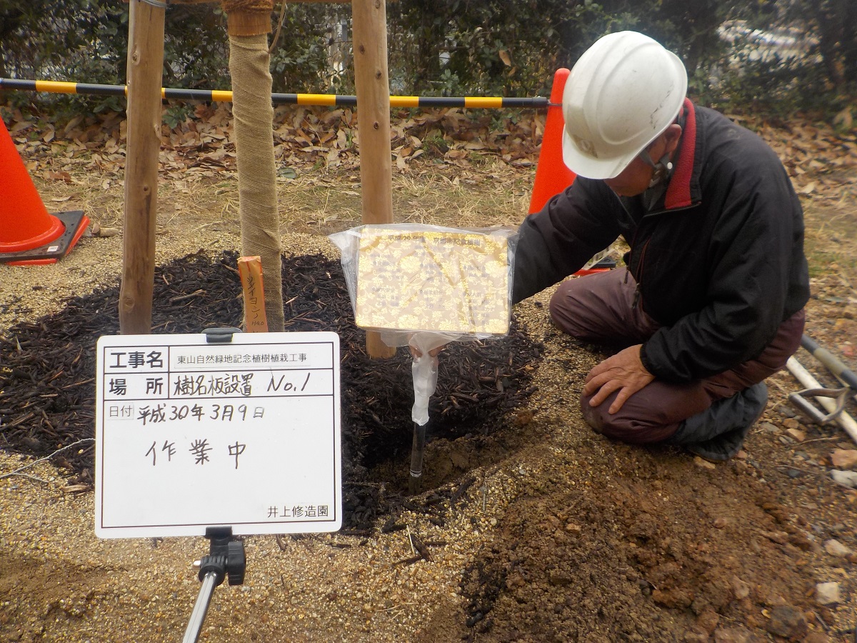 植樹を実施された皆様には感謝状が贈呈され、お名前や慶事の内容を記載した記念プレートを設置し、記念や思い出を残します。(関心がおありの方は 京都市 記念植樹 で検索してみて下さい)