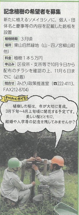 京都市では、今年もソメイヨシノ記念植樹のご希望者の募集が行われます。今後も、ご縁あれば当事業所が、市の業者として樹の選別から植樹、銘板の設置、育成のお世話等に当たる場合もあります。