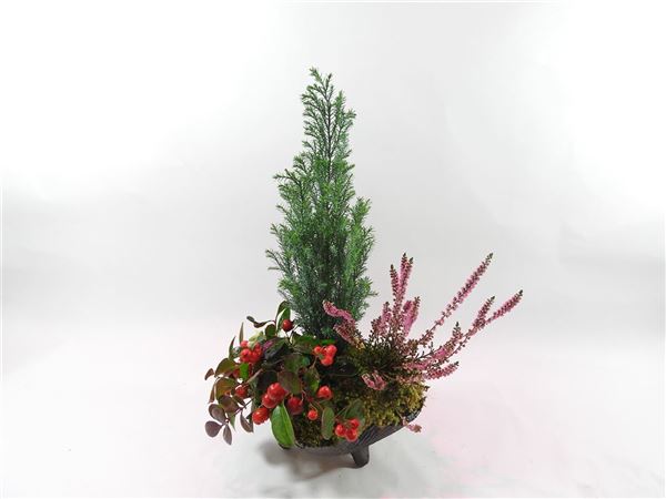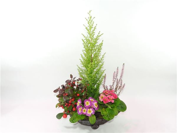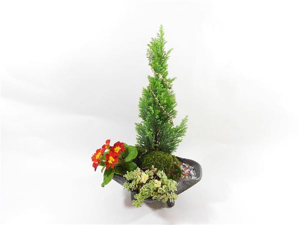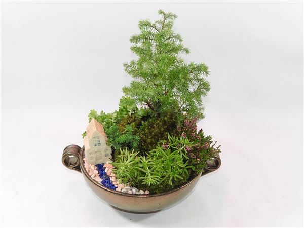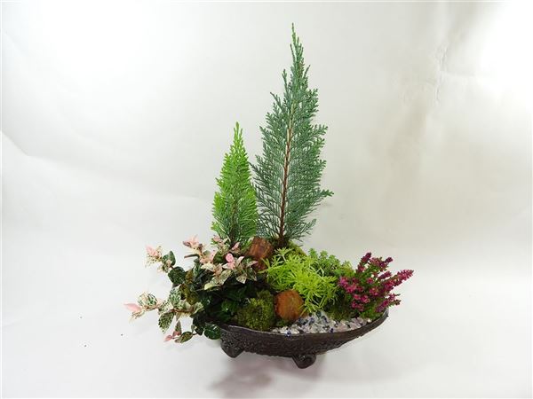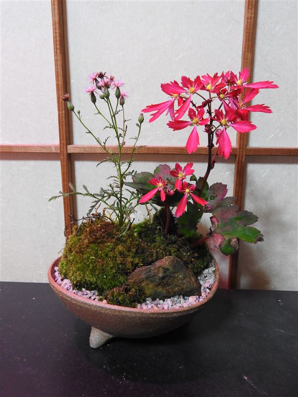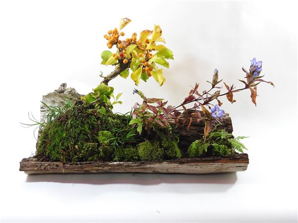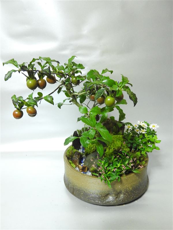 盆栽仕立ての木と、主に山野草を合わせて、力強さと優しさの
