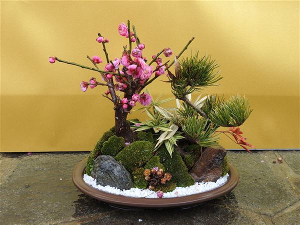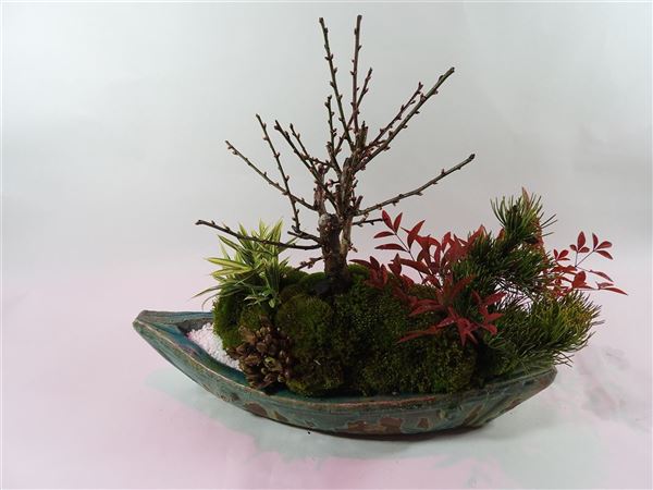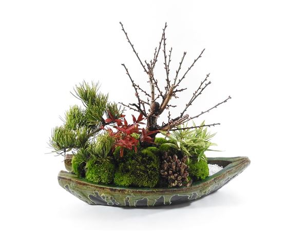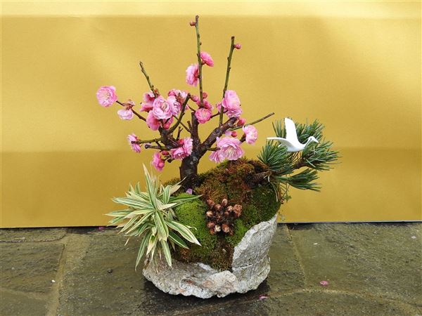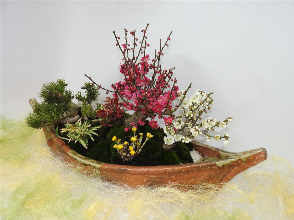 超大作!長さ80cm余の”宝船”を鉢に使った、堂々たる松竹梅。