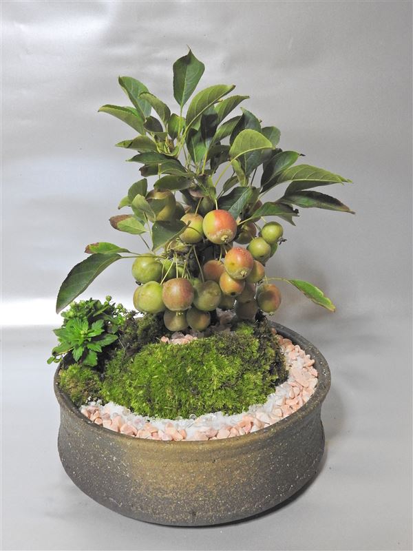 花材:姫リンゴ・いわよめな・山苔・撒き石(桃色系)