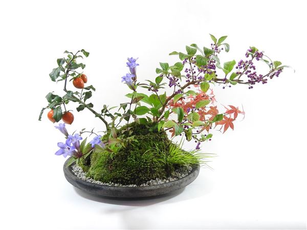 花材:ろうや柿・苔・箱根菊・姫タデ・石・撒き石